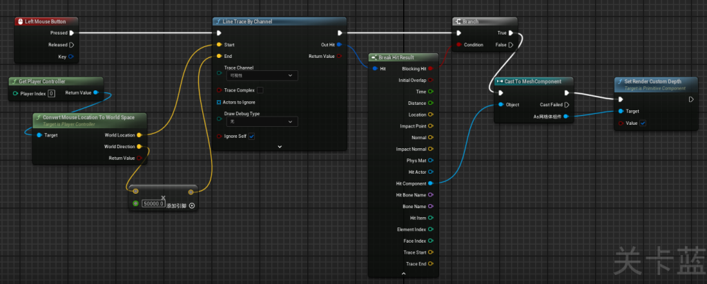 关键节点 Line Trace By Channel 和 Set Render Custom Depth(深度渲染模式),下方为完整示例