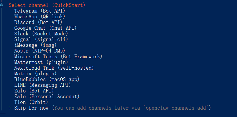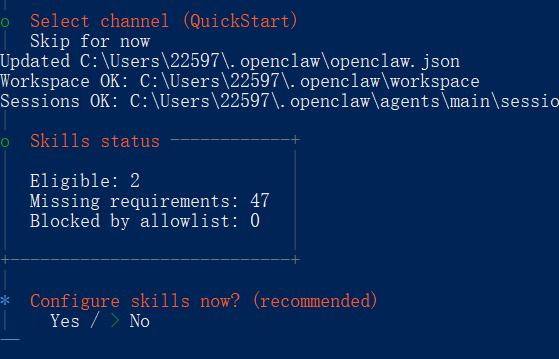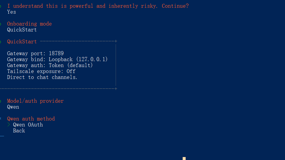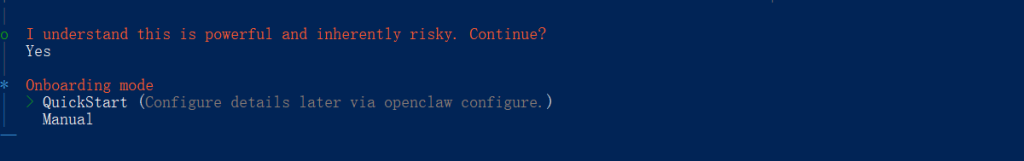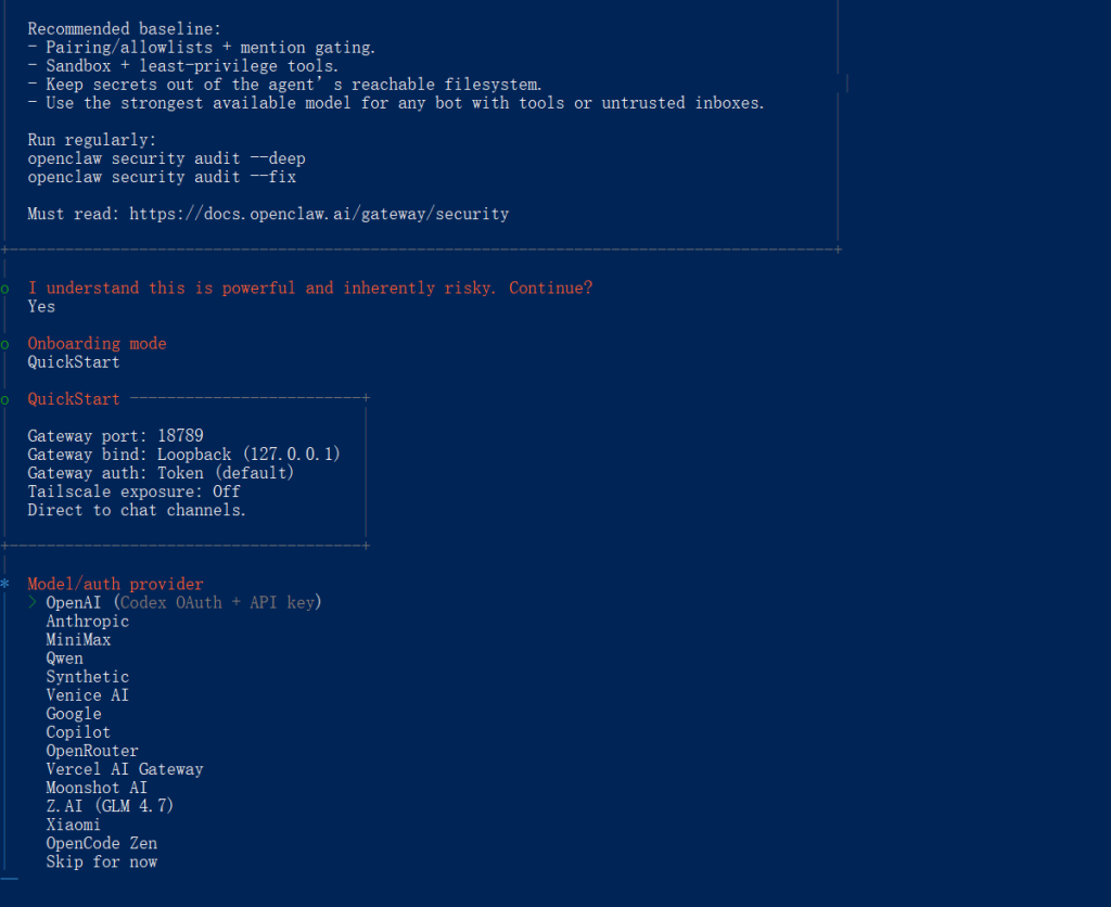 执行命令后需要等待十几分钟,命令行会自动安装 openclaw ,之后会自动弹出配置项