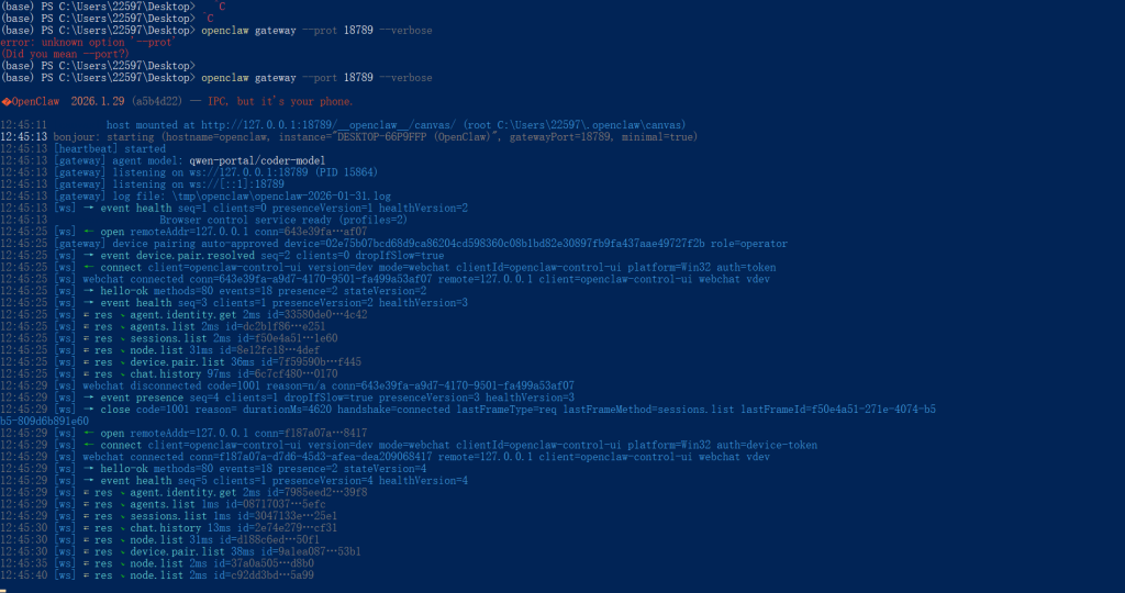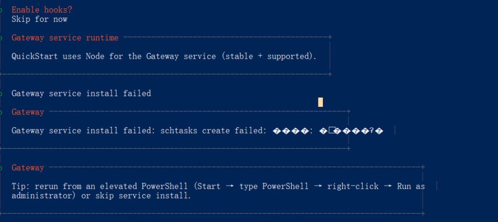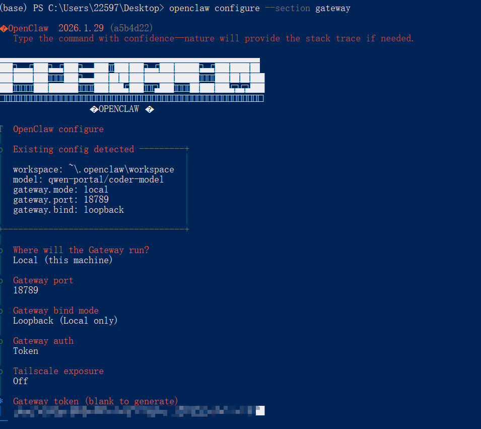 配置网关服务,这里正常会报错,当访问 127.0.0.1:18789/?token=“” 会访问不到;尝试手动启动网关