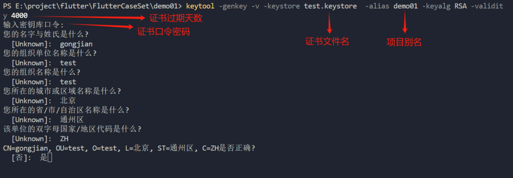 keytool -genkey -v -keystore test.keystore -alias demo01 -keyalg RSA -validity 4000